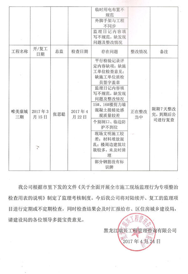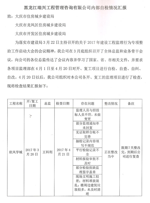 黑龙江瑞兴工程管理咨询有限公司内部自检情况汇报